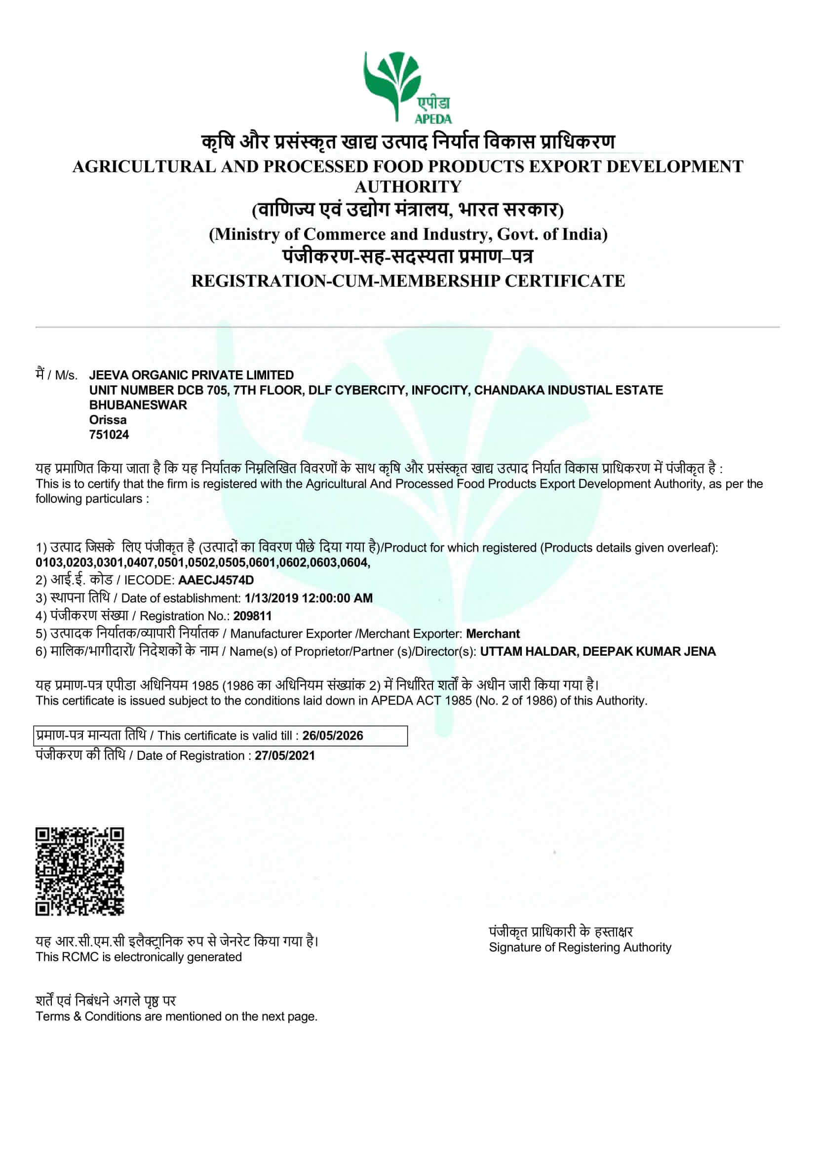 At Jeeva Organic, we are proud to be accredited with the APEDA (Agricultural and Processed Food Products Export Development Authority) certificate. This certification is a testament to our dedication to quality, hygiene, and adherence to international standards in the export of agricultural and processed food products.