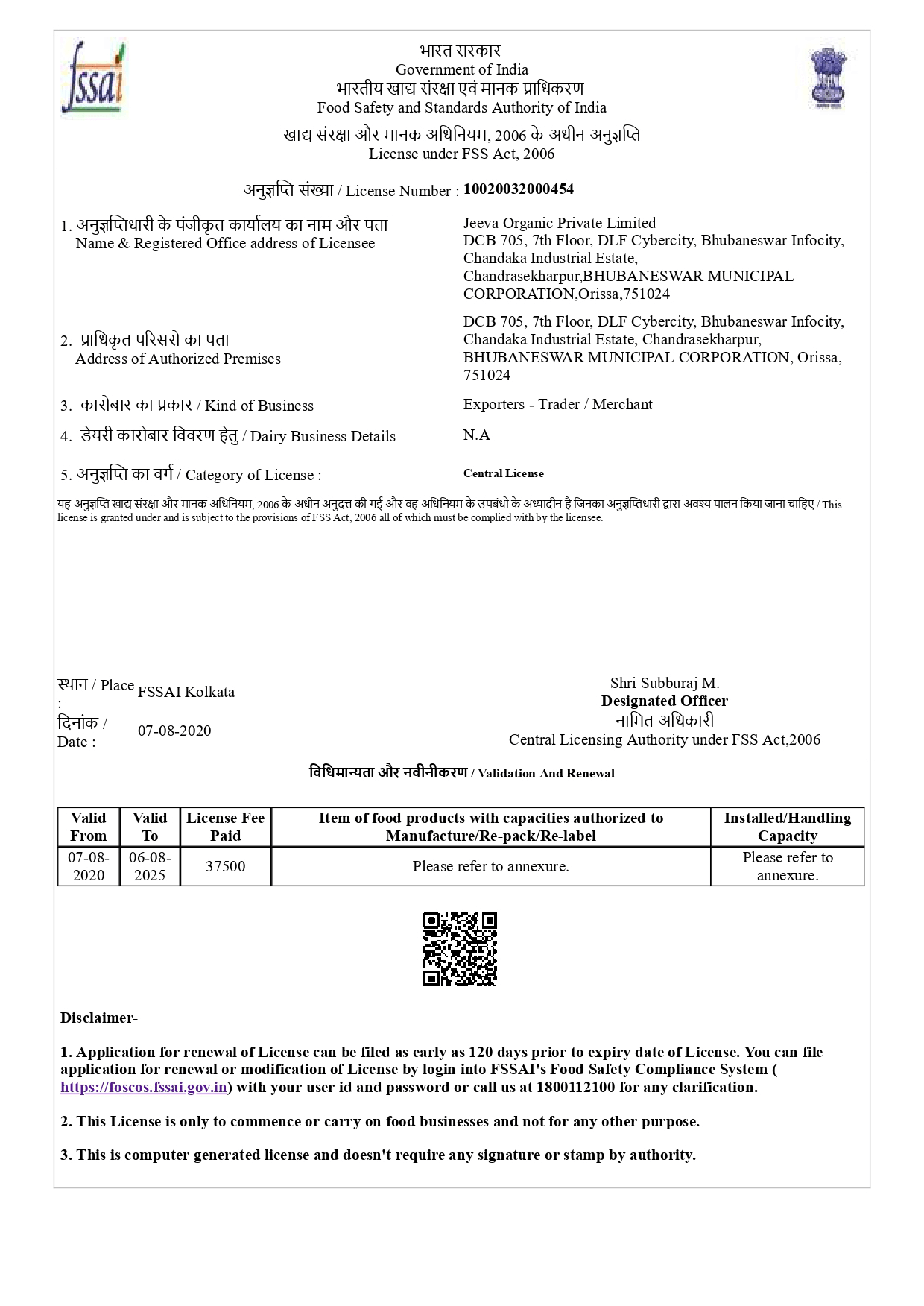 Jeeva Organic’s FSSAI registration, issued by the Food Safety and Standards Authority of India, affirms our dedication to delivering ingredients that comply with the food safety regulations in India. This registration reflects our commitment to ensuring the well-being of consumers in the country by meeting the highest safety and quality standards established by the Indian regulatory authority.