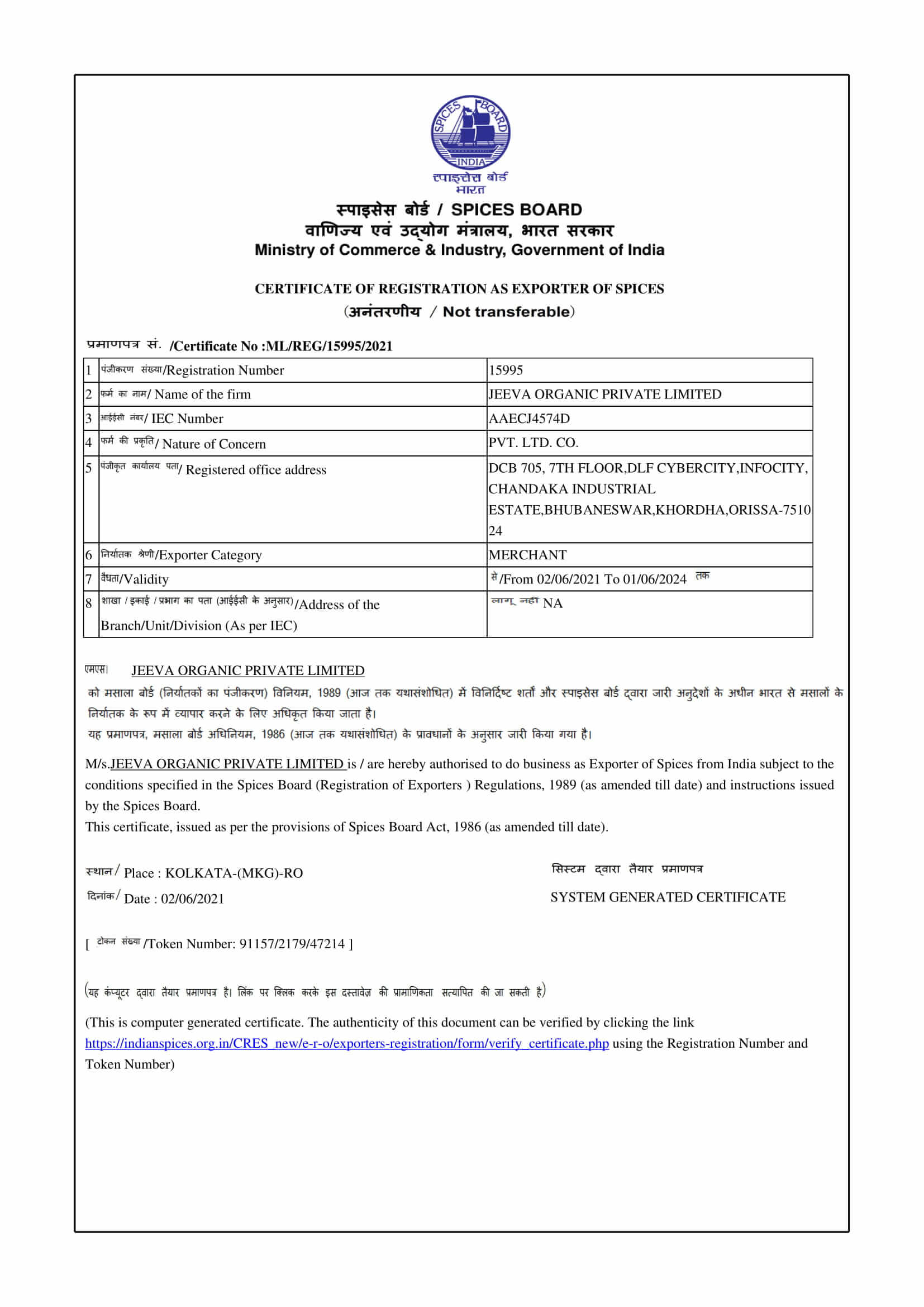Jeeva Organic proudly holds the Certificate of Registration as Exporter of Spices, a testament to our capability and compliance in the spice export industry. This certification showcases our expertise in the spice sector, emphasizing our commitment to meeting the specific requirements and expectations of global markets.